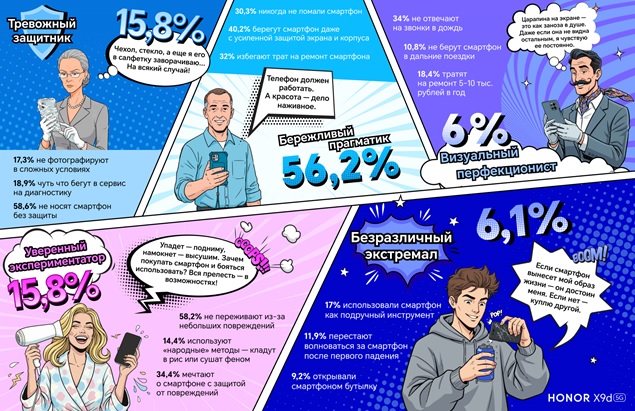 Самые редкие типы — безразличные экстремалы (6,1%), считающие, что смартфон должен пережить любые приключения, и визуальные перфекционисты (6,0%), для которых царапина на корпусе — это личная драма (последних больше всего среди молодежи 18-25 лет — 8,9%).