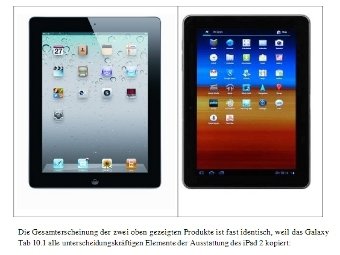 Речь идет об одной из иллюстраций к жалобе Apple на компанию Samsung, которая была подана в земельный суд Дюссельдорфа 4 августа. На иллюстрации изображены iPad 2 и Galaxy Tab 10.1. На картинке пропорции корпусов планшетов практически идентичны, хотя в действительности Galaxy Tab должен быть "уже", чем iPad.