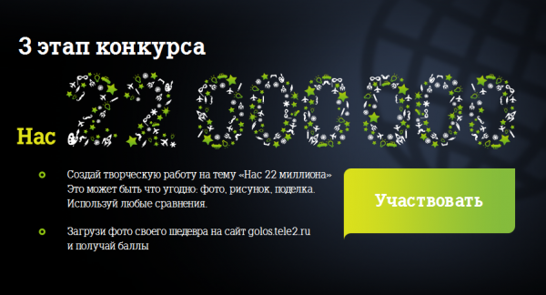 Напоминаем, что желающим принять участие и побороться за главный приз – приглашение на вечеринку года с участием европейского диджея Пита Тонга (Pete Tong) в Санкт-Петербурге или планшетный компьютер, необходимо творчески объяснить, что для них значит понятие «22 миллиона», используя любые средства: фотографии, рисунки, поделки и тексты, и загрузить свои работы на сайт golos.tele2.ru. Голосовать за работы на сайте golos.tele2.ru. могут все, кто имеет аккаунт в социальных сетях Facebook, «ВКонтакте», «Одноклассники» и «Мой мир.Mail.ru». Количество фотографий от каждого зарегистрировавшегося участника может быть не более шести.
