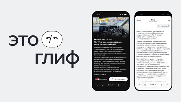 «Глиф» — новостной ИИ-ассистент от Дзена, который помогает разобраться в происходящем и отвечает на вопрос «Что это значит?». Например, одну и ту же новость он может объяснить по-разному: с акцентом на экономические последствия, технологический контекст или влияние на повседневную жизнь в зависимости от интересов пользователя.