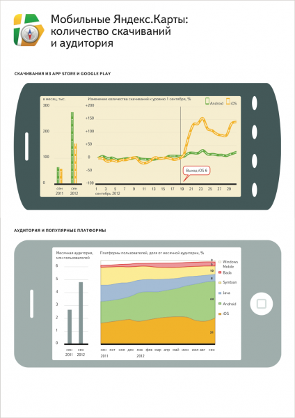 В прошедшем месяце аудитория «Яндекс.Карт» для платформы iOS по сравнению с сентябрем 2011 г. увеличилась в 2,2 раза, при том, что доля владельцев устройств на iOS среди пользователей этого приложения за тот же год возросла на 20%.