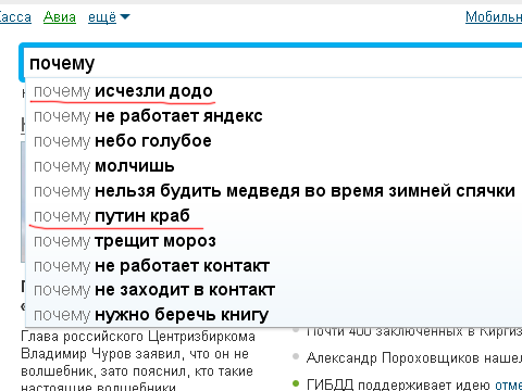 Казусы поисковых подсказок пользователи заметили давно и с тех пор регулярно их фиксируют и обмениваются скриншотами самых нелепых запросов. В последнее время Рунет активно обсуждал "что будет если отсканировать зеркало" и "почему Путин краб", а "Ленин гриб", "как сделать волшебную палочку" и "мне стало совестно и я не мог докончить начатой речи". Неизменно актуальными остаются запросы "куда деваются носки", "настоящая фамили Медведева" и "что делать если я шампунь".