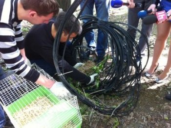 Когда муфту снимали со столба, из гнезда выскочила белка, но не спешила удаляться от своего жилища. Судя по обеспокоенному поведению белочки, в гнезде оставались бельчата. Пока представители компании-провайдера и работники парка снимали провода со столба, она находилась поблизости и наблюдала за происходящим. Участники не стали искать детенышей-бельчат, а только поместили все гнездо целиком в просторный домик, который повесили обратно на столб, чтобы мама-белка смогла вернуться к себе домой на прежнее место.