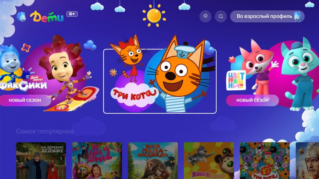В разделе представлены и полнометражные фильмы для просмотра всей семьей: советские киносказки «Золушка», «Финист — Ясный сокол», «Морозко», голливудские хиты «Дети шпионов», «Чудо», российские фильмы «Домовенок Кузя», «Последний богатырь» и многое другое. Юным зрителям также будут доступны мультсериалы с полюбившимися героями: «Смешарики», «Малышарики», «Фиксики» и «Три кота».