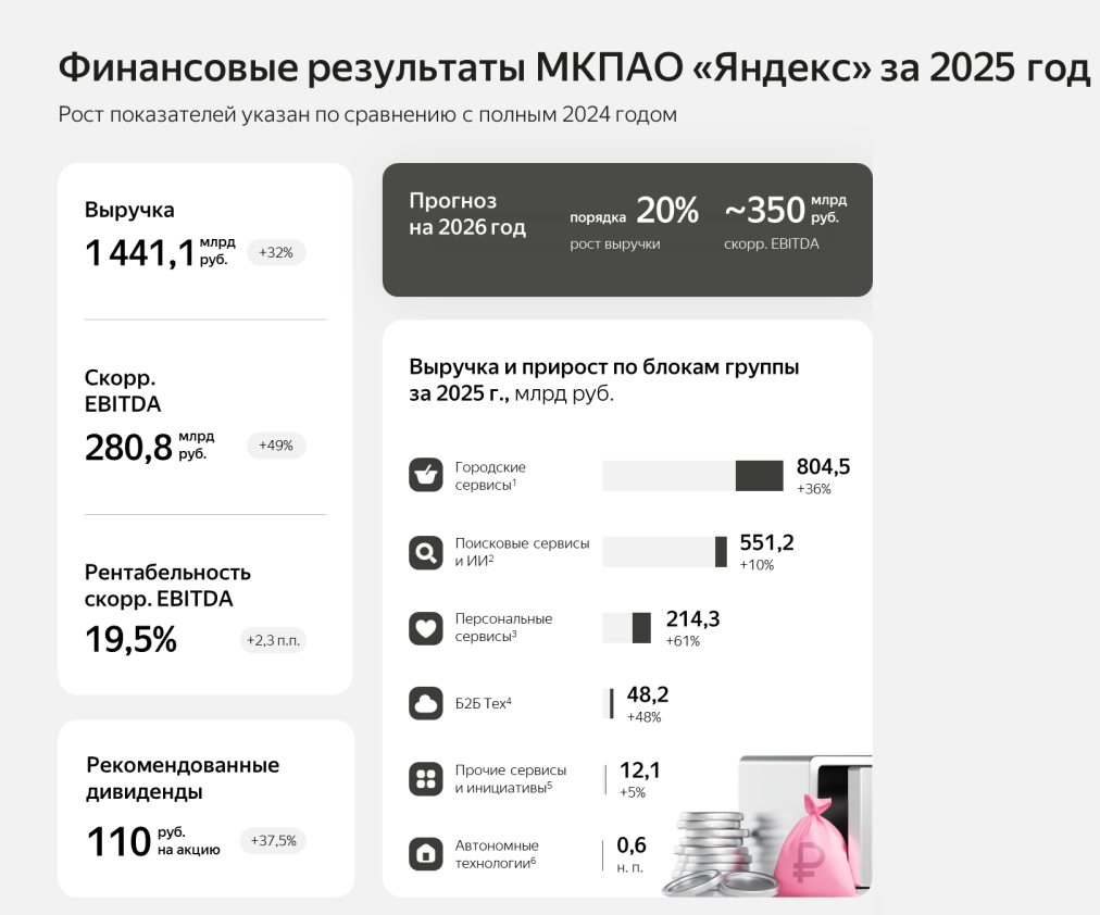 Российская мультисервисная компания «Яндекс» раскрыла финансовые результаты за четвёртый квартал и весь 2025 год. Выручка группы за отчётный период выросла на 32% по сравнению с 2024 годом и достигла 1,44 трлн рублей.