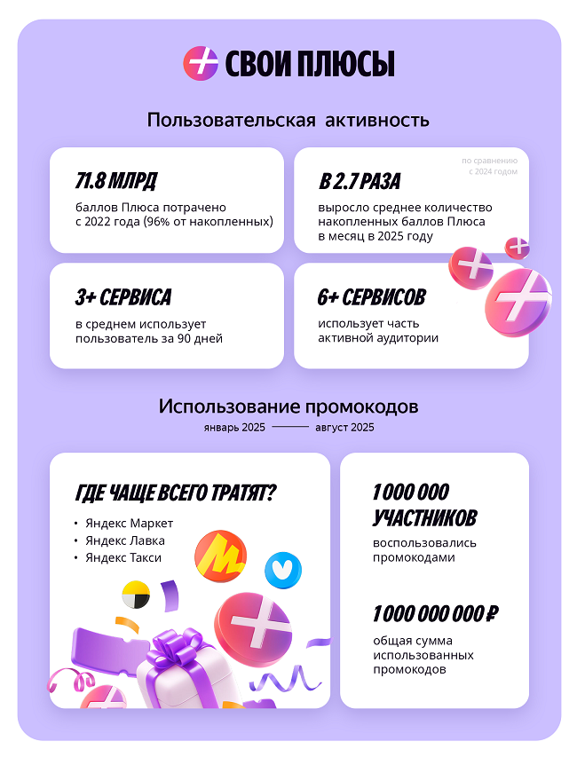 Пользователи уже давно привыкли к баллам Плюса, которые выдаются за покупку товаров, пользование услугами «Яндекса» и участие в специальных акциях. Согласно статистике компании, популярность программы стремительно растёт: только за период с 2022 года пользователями было истрачено около 71,8 миллиардов баллов, что составляет почти 96% от общего количества накопленных. Средний показатель прироста баллов среди активных пользователей увеличился в 2,7 раза по сравнению с предыдущими годами.