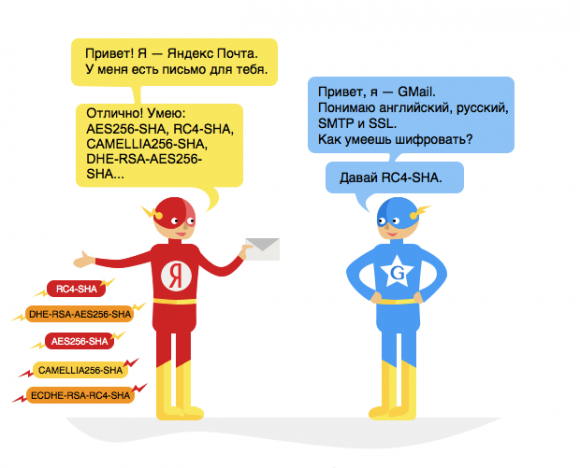 Шифрование соединения между человеком и почтой уже довольно распространено среди массовых сервисов, однако переписка между почтовыми системами часто шла в незащищенном виде. Теперь, когда пользователь отправляет письмо, Яндекс.Почта проверяет, может ли почтовый сервис получателя принять письмо по зашифрованному соединению. Если да, обмен сообщениями происходит по SSL/TLS-потоколу.